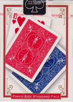This Bicycle Standard Blue from 2008 was sold in a set wrapped with a paired red deck. Nevertheless, this blue deck has no text in the bottom (which is completely white). Made in Ohio