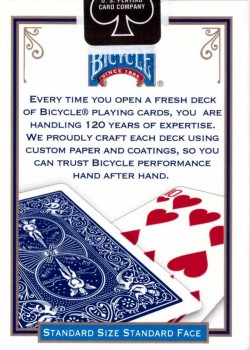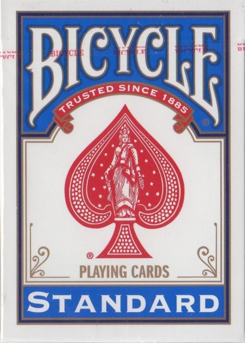 This Bicycle Standard Blue from 2009 was sold in a set wrapped with a paired red deck. No barcode but just legal text in the bottom with year 2009