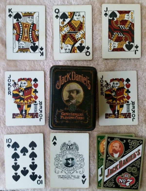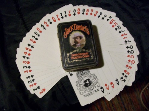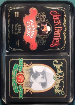 Two sets (1 black, 1 green) of larger sized (slightly bigger than poker size) playing card in a tin case made by Hudson-Scott & Sons, Carlisle, England.