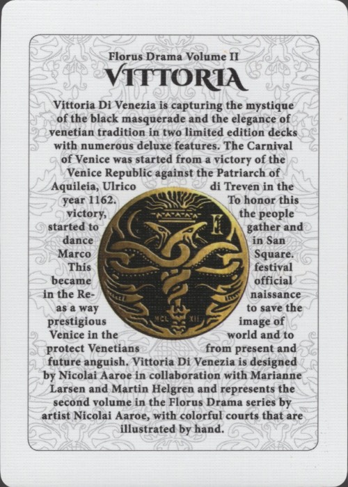 Capturing the mystique of the black masquerade and the elegance of venetian tradition, Vittoria di Venezia form the second volume in the Florus Drama series of fine art playing cards by artist Nicolai Aaroe. Each edition is an extravagant set of 54 poker sized playing cards beautifully illustrated in hand and printed in limited editions with many deluxe features.KickStarter: https://www.kickstarter.com/projects/nicolaiaaroe/vittoria-playing-cards