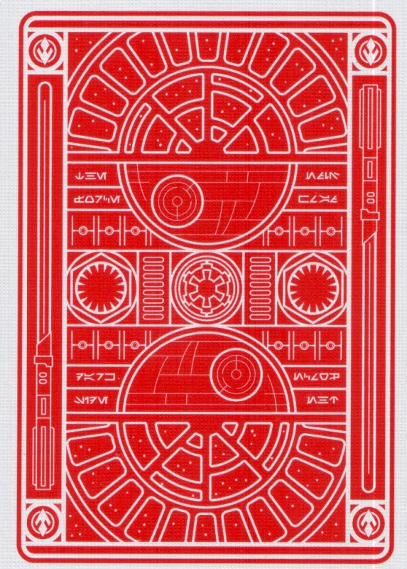 Across the red back design, it's all about the details - from the Death Star to the First Order, Sith, and Empire insignia. In the center, a repeating pattern of TIE fighters supports Darth Vader's lightsaber on either side.