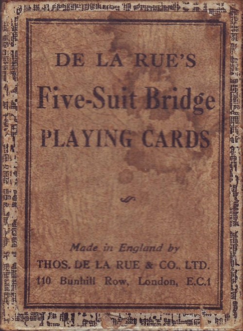 From the 'World of Playing Cards': Five Suit Bridge was invented in Vienna in 1937 by Walter W. Marseille and Dr. Paul Stern. At a time when cricket, chess and bridge were popular social games, special 66-card decks went on sale in the UK manufactured by De la Rue and Waddington’s with the fifth suit as crowns (called “Royals”). However, because the game was complex it proved to be unpopular, they were withdrawn in 1939 and have been forgotten.