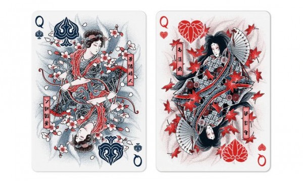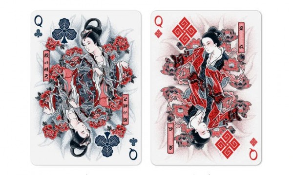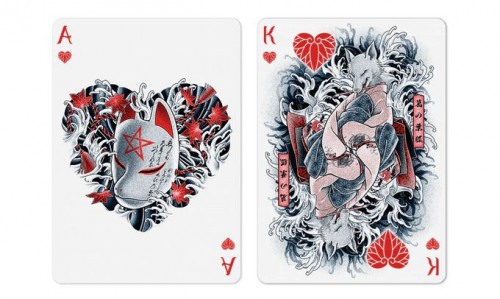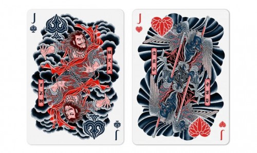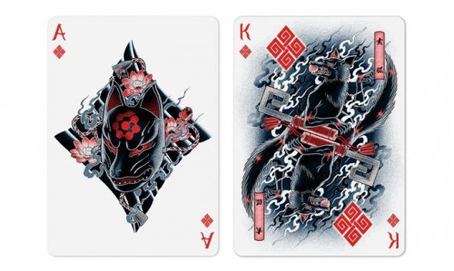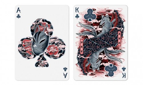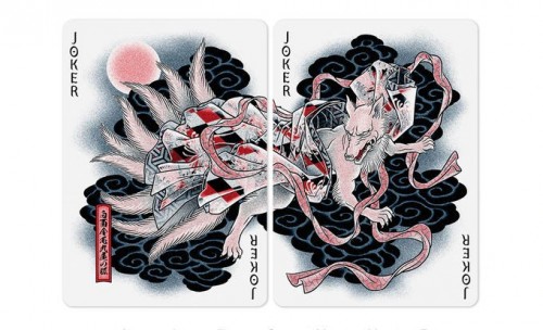 In Kitsune, we continue to translate and transform the traditional Japanese tattoo art form of Wabori into playing card style, retaining as well as enhancing many of the interesting and delightful features we had in Sumi Playing Cards. The focus of Kitsune centers around the fox spirit, a staple in Japanese folklore. We scoured many different sources of folktales, stories and myths about fox spirits and selected a few well-known ones as sources of inspiration for the characters in the court cards. Kistune continues to serve as a homage to Wabori and faithfully represents the visual nuances and quality that is the hallmark of Japanese traditional tattoo once again, creating a visual playing card masterpiece like no other, a masterpiece that weaves fantastical stories of begone time with modern playing card aesthetics.