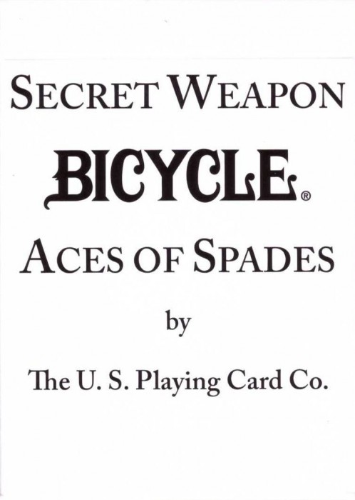 Contains only 55 copies of Ace of Spades and a History of the Secret Weapon card. History from USPCC - The Ace of Spades served a famous purpose in the war in Vietnam. In 1966, two lieutenants wrote The United States Playing Card Company and requested decks containing nothing but the Ace of Spades. The cards were useful in psychological warfare as the Viet Cong were very superstitious and highly frightened by this Ace. The French previously had occupied Indo-China, and in French fortunetelling with cards, the Spades predicted death and suffering. The Viet Cong even regarded lady liberty as a goddess of death. USPC shipped thousands of the requested decks gratis to our troops in Vietnam. These decks were housed in plain white tuckcases, inscribed with Bicycle Secret Weapon. The cards were deliberately scattered in the jungle and in hostile villages during raids. The very sight of the Ace card was said to cause many Viet Cong to flee.