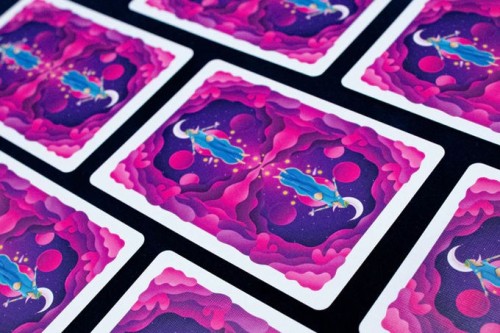 On first glance, the court cards consist of silhouettes of kings, queens and jacks occupying a bigger part of the cards. However, upon a closer look, each of the silhouettes is, in fact, a window into a different narrative. With each of the cards, you get to discover a new character and their thrilling adventure in the outer space. The court cards vary from the calming hues of purple into the fiery orange and red tones.