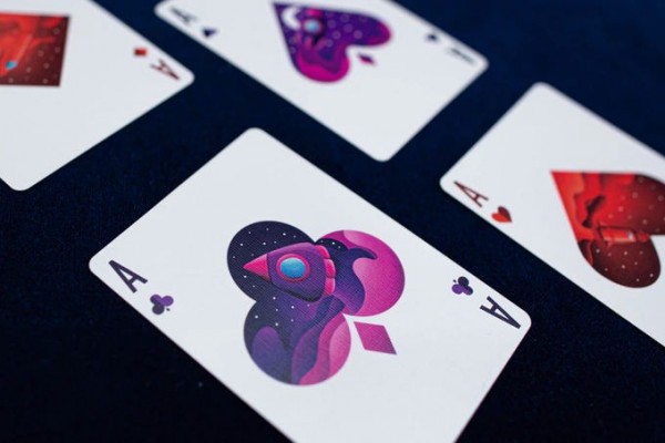 The aces follow a similar design to the court cards, featuring a silhouette of a particular suit with a vista of a space shuttle flying through open space behind it.