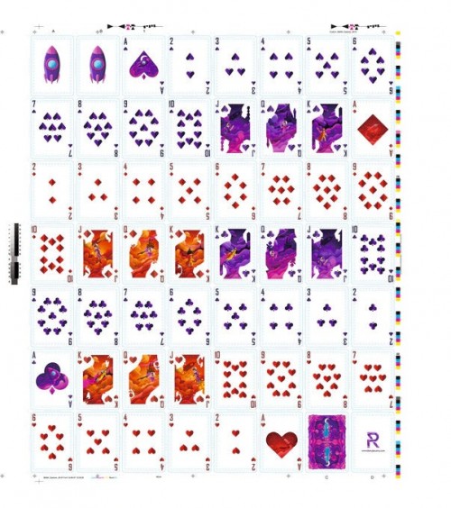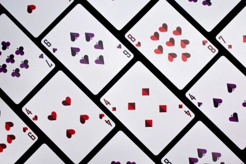 The number cards keep a classic design to balance out the many details of the court cards. You can find the numbers and suit signs in two colours as well, purple and deep red.