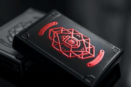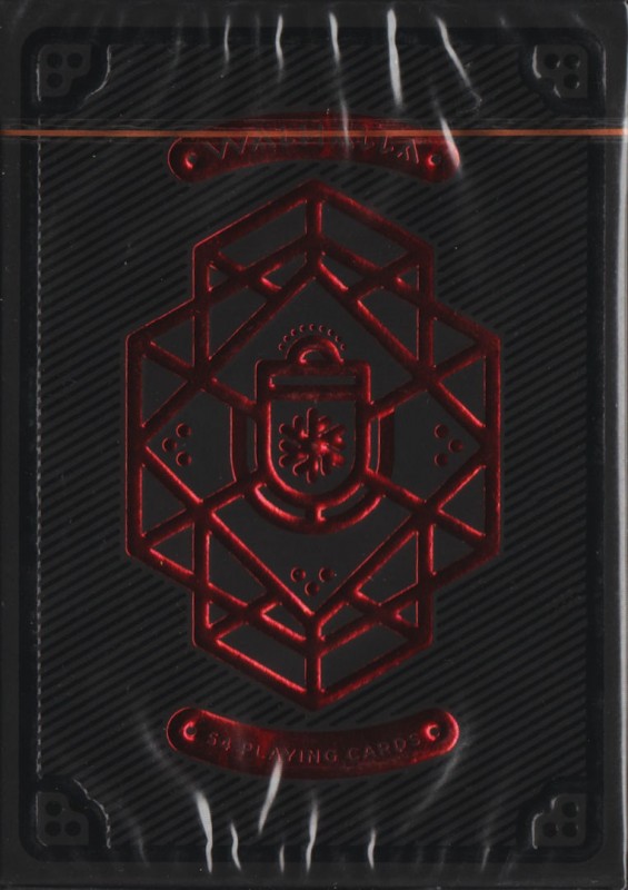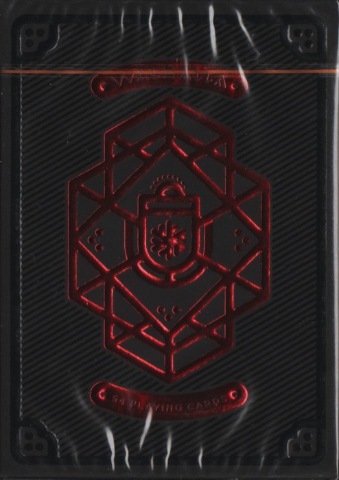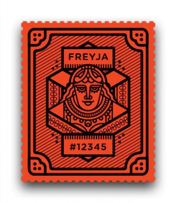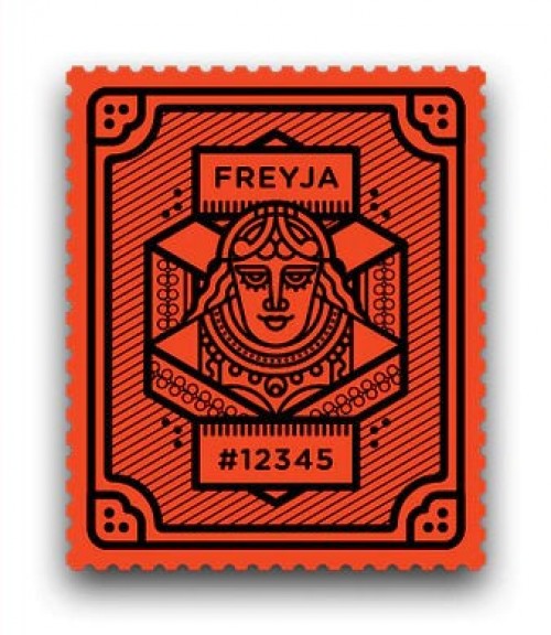 Deck of Freyja is made of black soft touch tuck box, embossed, with special Merlot Red foil and selective varnish applied, to outline design elements. Freyja deck's cards are designed in silver and gold metallic inks, with black background: