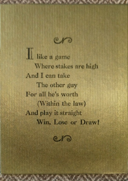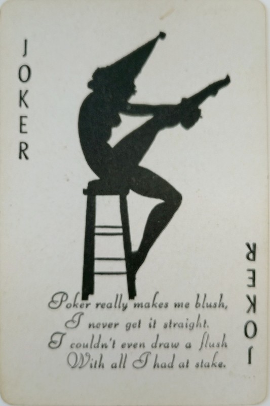 The set came in a box that is designed to look like a vintage book; no doubt many of these sets went undetected while shelved between real books. There is a poem on the inner box as well as a different one on the joker. The poems and images, taken together, tell a story; the brunette is pictured on one card as drawing unsuccessfully to a straight flush, and is resignedly taking down her shoulder straps. The same girl on the second deck, though topless, is more confident as she boldly draws a hidden ace of hearts from her waistband.