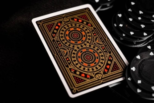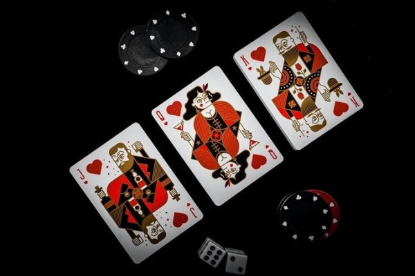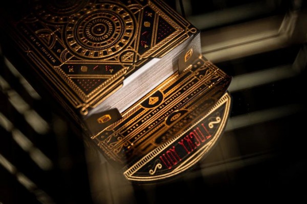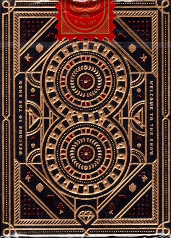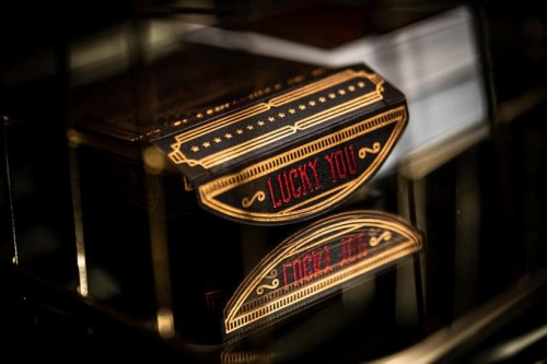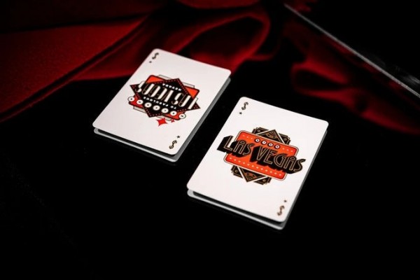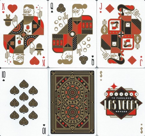 Following the design of the box, the backs of the cards boast a red-and-gold pattern similar to the one from the top of the box, made up of two adjoining roulette wheels lined by diamonds, martini glasses, and other quintessential Las Vegas elements.