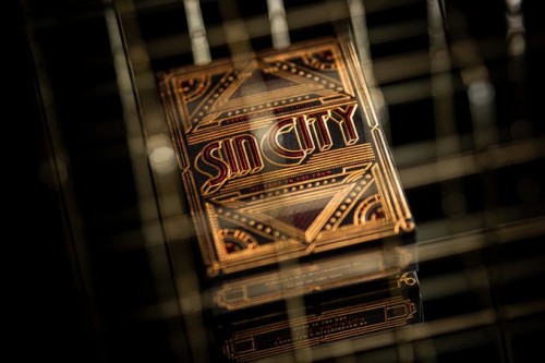 The front of the box features large red letters saying “Sin City” placed in the middle of a golden diamond, while the back and the sides are completely covered in a symmetrical design, which is repeated throughout the whole deck.
