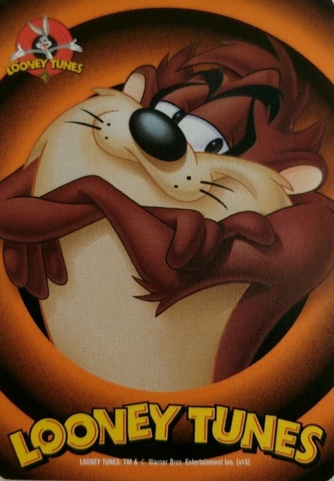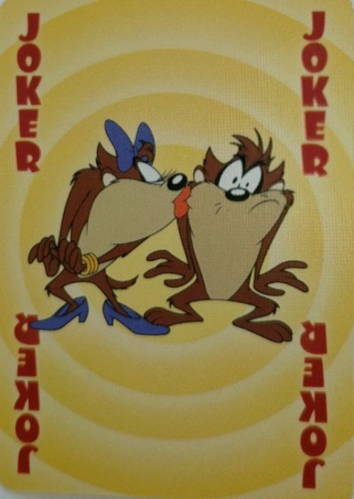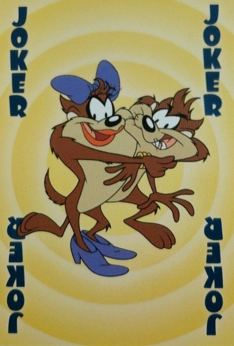 This is the Taz / Tasmanian Devil edition in the Aquarius Looney Tunes series. A unique image per card, alternating between (a) Tasmanian Devil screenshots from classic Warner Bros. animation interacting with the likes of Bugs Bunny, and (b) artwork of Taz solo or with Mrs. Taz. Card back matches the front of the tuck box. Linen finish, printed in China, very similar to the other decks in the series. Jokers feature Taz and Mrs. Taz romantically entangled.