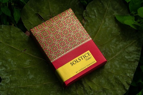 The Solstice is the third deck in a 4 deck series thematically based on the Equinox and Solstice Calendar events. Solstice continues the series them by celebrating the Summer Solstice ushering in the beautiful colors of summer. The Solstice tuck case features a premium paper stock with three, intricately foiled color patterns. The combinations of colors on the tuck create a vibrant presentation. The Standard Edition Solstice has a sleek and simle design that makes a perfect pairing to its more elaborate Limited and Gilded Edition siblings. The completely custom court cards continue this theme with refreshing colors of summer and simple but beautiful court cards that are a refreshing change to the "same old" cards you might be used to. When playing cards or table games in the coming summer months, choosing the Solstice deck to deal out will not only freshen up your table scenery but you will find that The Solstice deck is also a highly functional, easily playable deck for all ages.