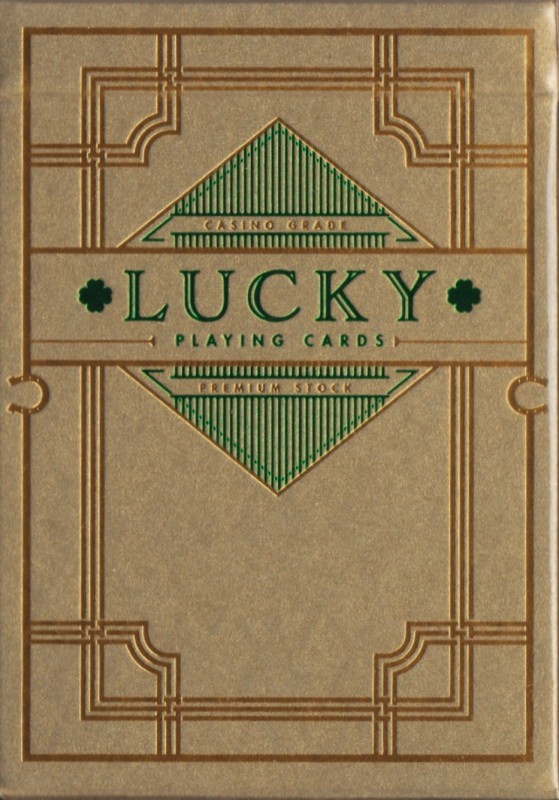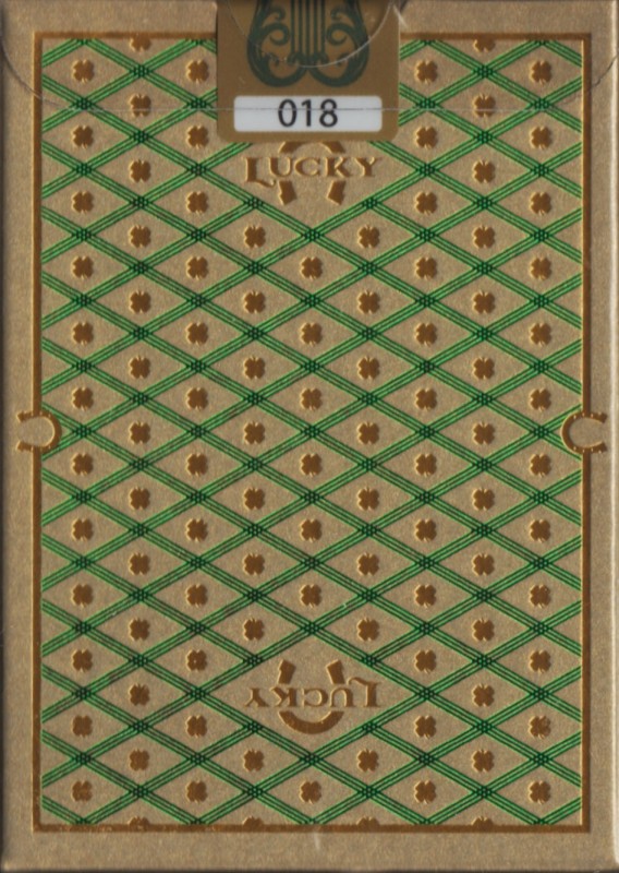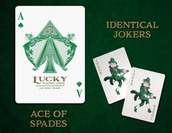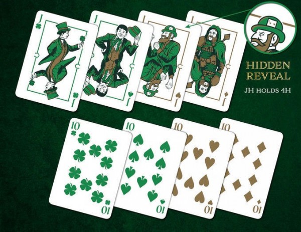 Fully Custom St. Patrick’s Day themed court feature along with a beautiful custom AOS and Identical Jokers. Clover pips are used in place of Clubs, as well as unique metallic gold and metallic green suits rather than traditional black and red.