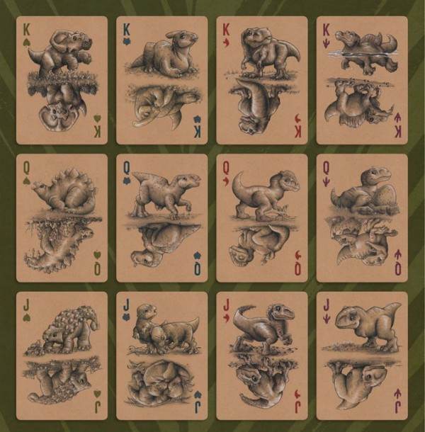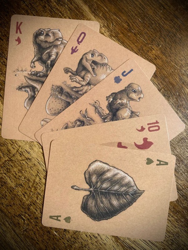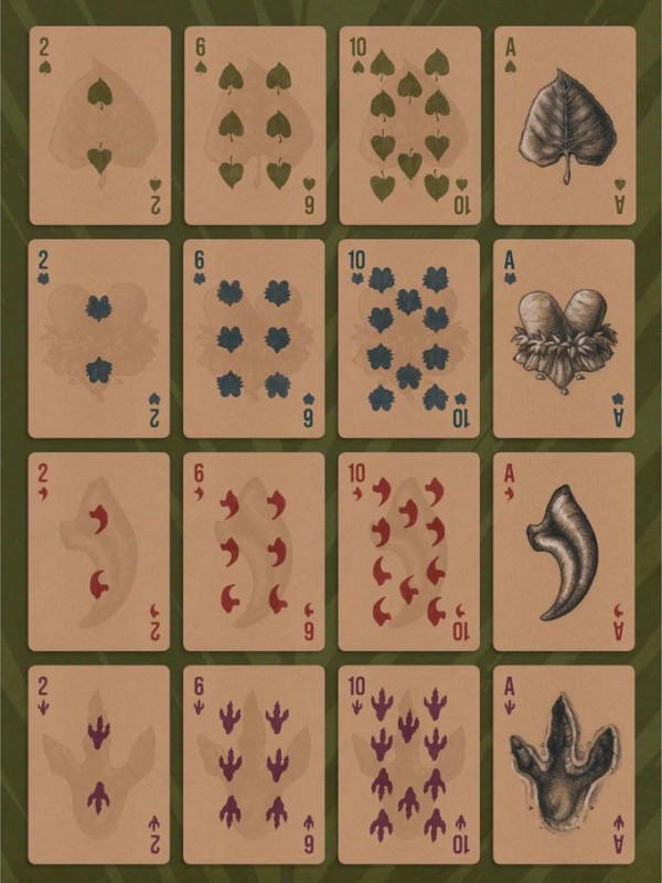 Pips and aces are hand-drawn and designed to fit their dinosaur companions. Herbivores are represented with leaves and eggs, carnivores with claws and footprints. Simple silhouettes and bold colors make every card and suit easily distinguishable.