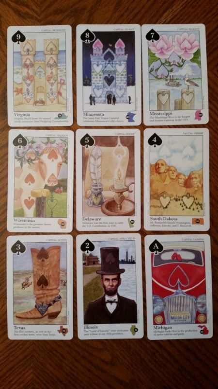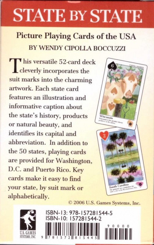 State by State Picture Playing Cards of the USA Cards was created by Wendy Cipolla Boccuzzi and published by US Game Systems. It is a semi-transformation deck featuring the 50 US States (plus Washington DC & Puerto Rico). This is a tarot card sized deck (2.75 x 4.75 inches).