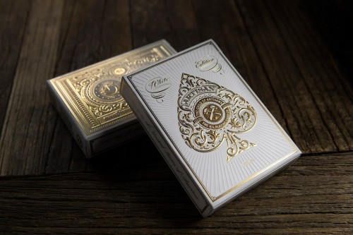 Also available in the earlier black version, this deck from Theory 11 was released in 2013, was illustrated by hand in South Africa and designed by Simon Frouws. They featured elegant gold foil stamped onto ultra-lux black paper derived from sustainable forests. Produced by USPCC, the stock is from FSC-certified papers derived from sustainable forests, vegetable-based inks and starch-based laminates. Sealed with a red tax-stamp, vintage sticker seal marked with the exact month and year of print. Containing largely standard face cards, the emphasis is on the premium foil tuck, card back artwork and stock quality that also was environmentally conscious.