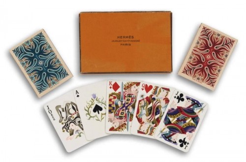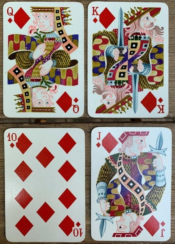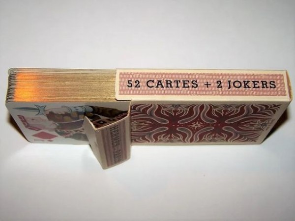 The second edition of this two-deck set was released around 1950. It includes two jokers plus the title card. The individual boxes are labeled "52 cartes + 2 jokers". Suit symbols on the court cards are cut off because the font used for the indices is larger. In addition, the design of the Jack of Diamonds differs from the first edition.