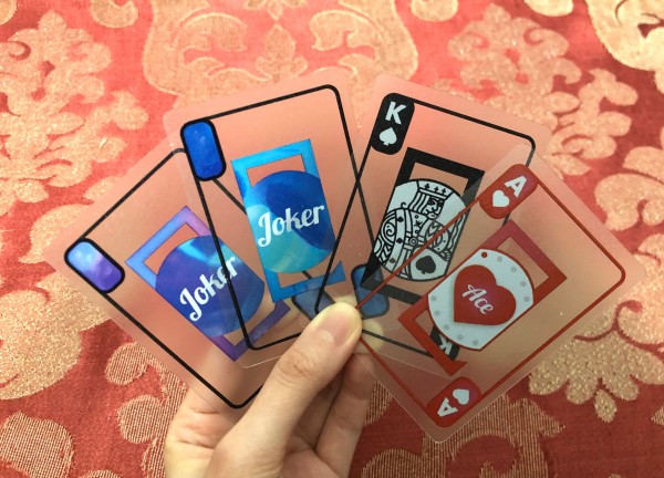 V. 2057 is a 54 cards transparent and waterproof playing deck (standard sized of 63x88mm). The cards are made with quality plastic that is stiff but flexible to bend in nature. The deck comes in waterproof push-lock display box.