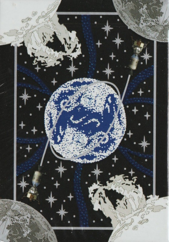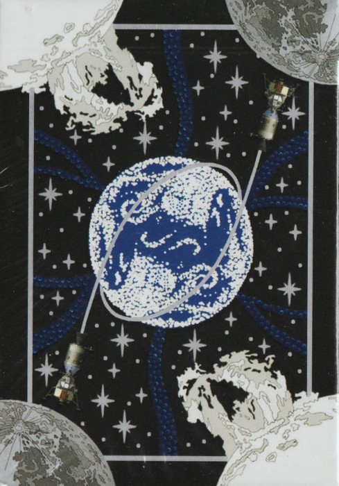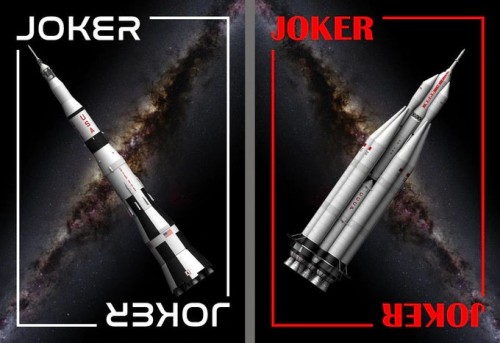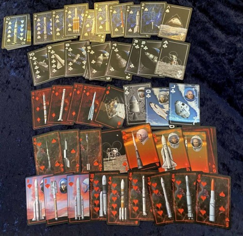 The Spades are rockets launched by United States, the Diamonds are rockets from the Soviet Union / Russia, the Hearts are rockets from other space-faring countries, and the Clubs are craft that have carried life into space. The spacecraft are meticulously modeled and placed over a red nebula (Diamonds and Hearts), or blue nebula or the Earth (Spades and Clubs).