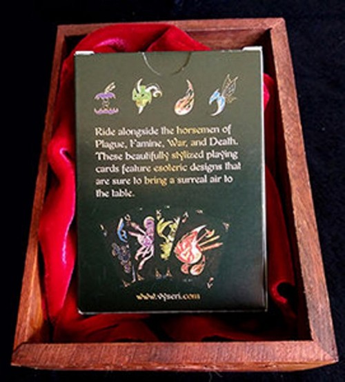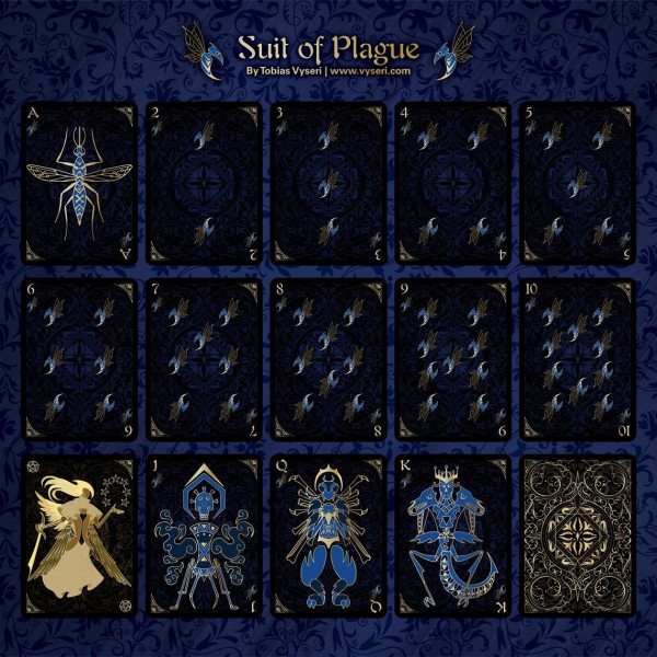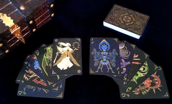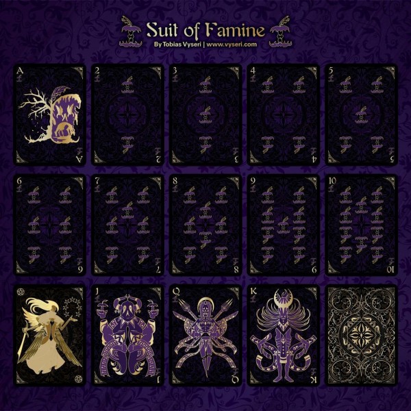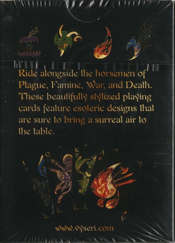 The cards have a lovely linen texture that makes shuffling them a breeze. The artwork is dark and haunting giving the viewer a grim look into the frightening creatures that herald the end times. The face cards are bursting with imagery and the entire deck is accented with gorgeous gold ink that glistens in the light.
