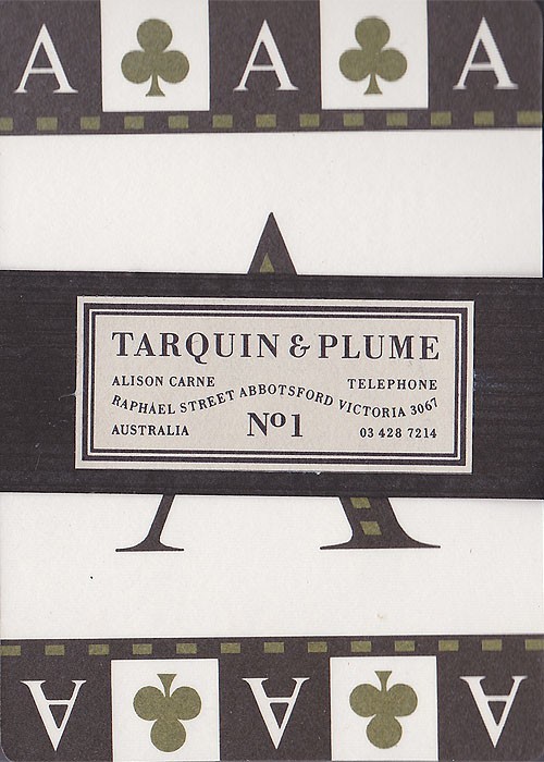 Despite the label on the front of the box (also wrapped around the cards), I could not confirm either a shop/company called Tarquin & Plume nor a designer by the name of Alison Carne. The inside of the box has a rubber stamp noting a change of address to England but a search in that area did not turn up any information.
