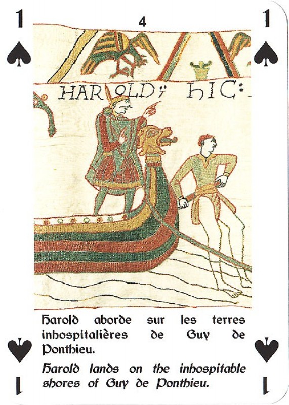Each card depicts images and scenes from the Bayeux Tapestry embroidered circa 1066 which tells the story of the Conquest of England by William Duke of Normandy. The Bayeux Tapestry is housed in the Bayeux Museum, Normandy, France..