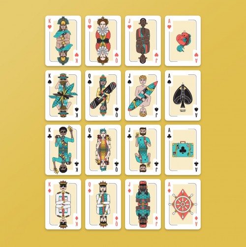 The deck is a standard deck of cards from Ace to King with four suits. We have designed the front and backs of the cards around a travel theme.