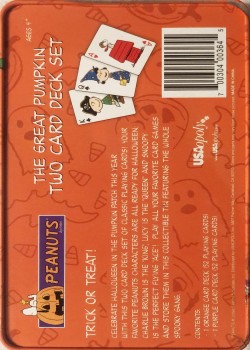 Two-deck set of bridge-sized plastic-coated Snoopy and Woodstock playing cards. One deck shows Snoopy on the back in a boater, suit, bowtie, and spats with a cane. It says "Want to See Some Fancy Shuffling?" The other shows four pictures of Woodstock, also in a boater, bowtie, and cane. The cards have outsize indices, and the faces of both decks are the same. The aces and court cards are standard but decorated. There are two different stylised capering jokers. There is a card with Basic Poker Rules, printed on both sides. There is a card with the Snoopy/Woodstock back showing International Contract Bridge Score.