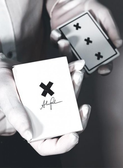 This is the second version of X Deck, a signature deck by Alex Pandrea. The triple Xs is resemble Alex Pandrea's time of birth: October 10 on 10 o'clock. While the first version Xs are made of paint strokes, this version Xs are made of duct tapes. The courts have the Arrco vintage style. It has a blank face and a duplicate Queen of Hearts with a missing cross on the back. The cards are thin crushed, and the tuckbox is using matte cardstock with an embossing on the X.