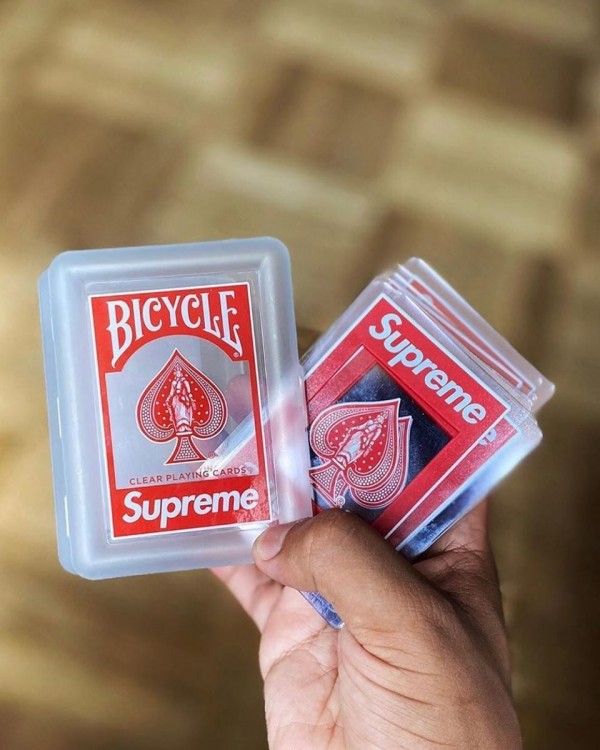 The Supreme Bicycle Clear Playing Cards released on August 20th, 2020, as a part of Supreme's FW20 Week 1 release. These cards feature Supreme branding on the front and back of every card and are made to be both durable and waterproof. The Supreme Bicycle Clear Playing Cards were released at a retail price of $18 USD.