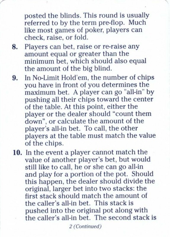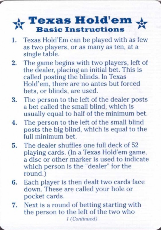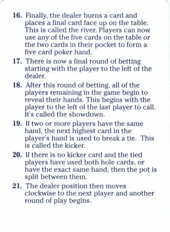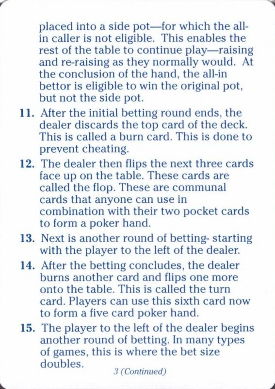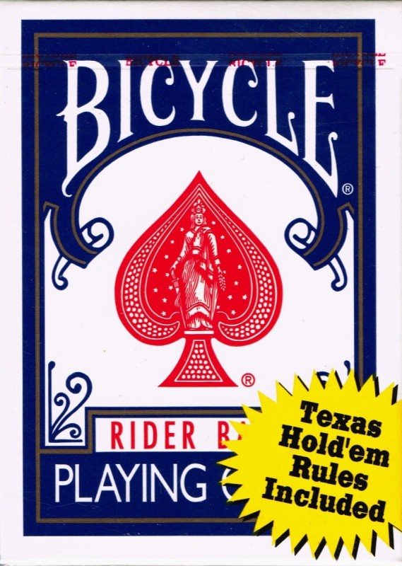 May or may not have special printed seal advertising them as a Texas Hold em deck. For this PCDB entry the tuckbox WITH the logo takes image priority. Usually includes Poker designation on the tuck top and Poker 808 on the bottom. All tuck variations for this deck do include 2 double sided cards with the rules for Texas Hold em.