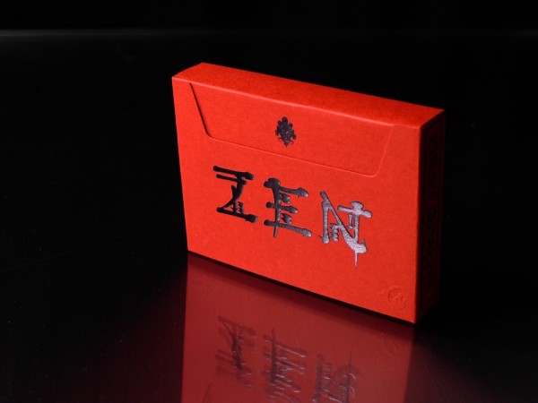 Experimental prototype Red Zen deck from the Expert Playing Card Company. Expert is always pushing the boundaries and experimenting with new techniques, and the red Zen is the latest experiment. In the never-ending effort to create the perfect deck we have changed the chemistry of the coating and the Zen is a little different. It’s a fully produced offset (not a low-end digital proof) deck with all the features. Expert made a batch to try the new technology and will not release them for sale. The tuck is our Expert Playing Card Co.’s sideways shape and is made of premium embossed red stock and stamped with black foil.