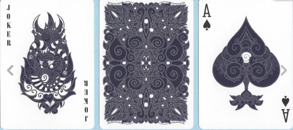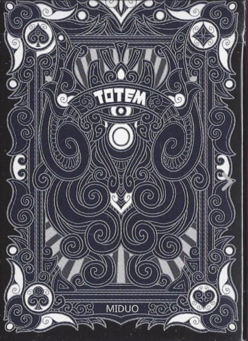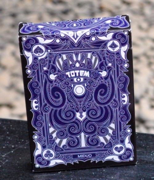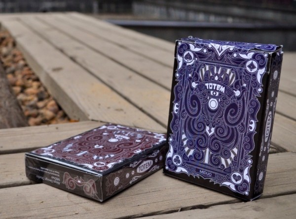 The Totem deck is printed in USPCC. High Quality stock, Smooth Finish(Blue edition), Linoid Finish ( Red edition). Metal ink on tuck and face, back . Totem Blue edition and Red edition, 2500 decks print for each edition .