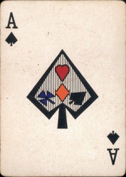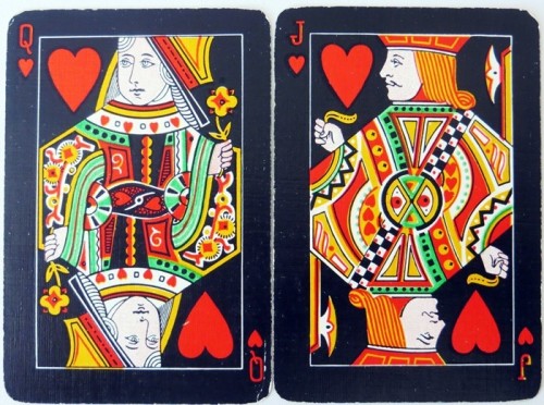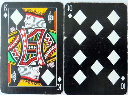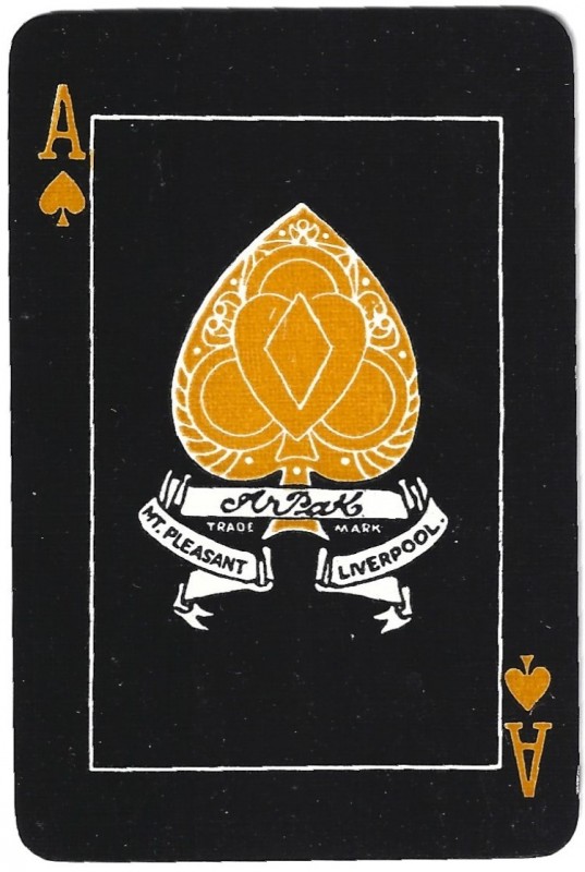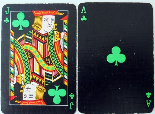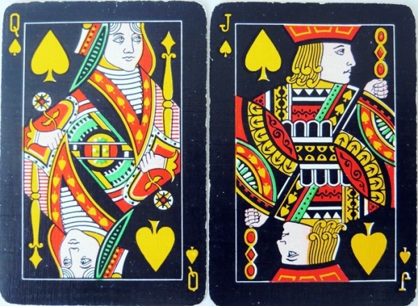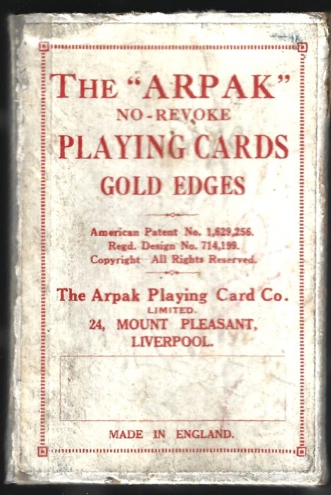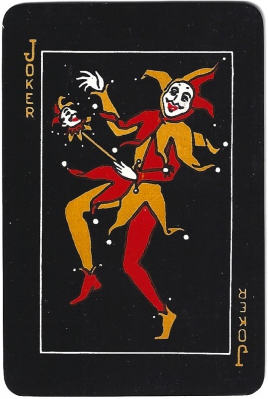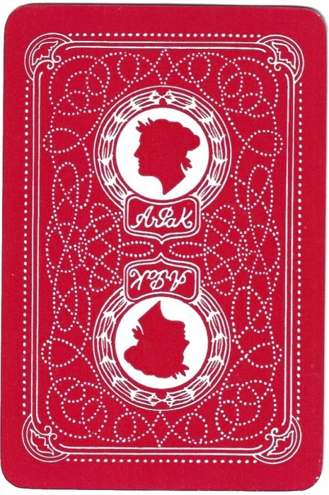 From the 'World of Playing Cards': All cards are on a black background which makes them look rather striking. The suit symbols and pips are coloured, intended to help reduce eye strain for people who find it difficult to distinguish the suit signs: spades-yellow, diamonds-white, clubs-green and hearts-red. Packs have 52 cards + 1 joker. Several different formal back designs are known, in red or blue and white, and some decks have gold edges. There are two different sizes of indices and widths of outer borders. Arpak ‘No-revoke’ decks are also known with advertisements on the reverse.