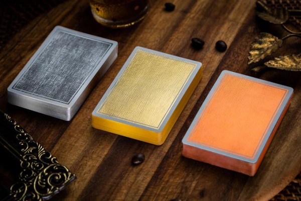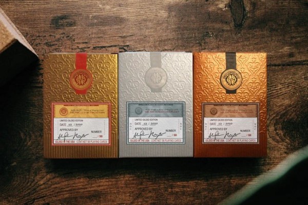 This Bronze deck features bronze gilding on the edges to match the deck colors and a custom designed numbered foil label. These gilded decks were exclusive to the Kickstarter campaign.
