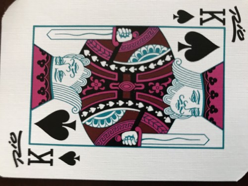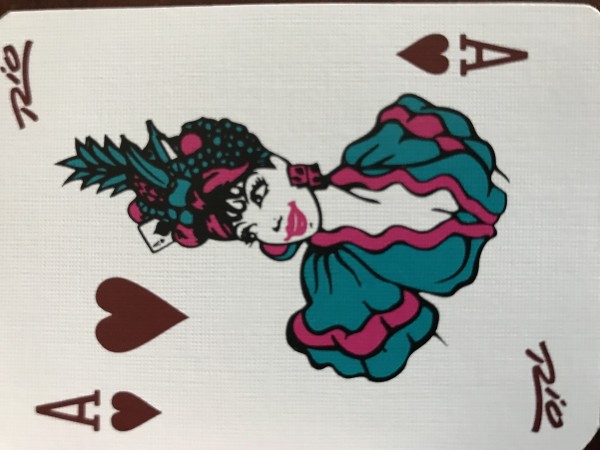 Rio Casino Deck, Robin bule color of back, Rio logo on corners (2) of the face cards and 10 on every suit, Bule and purple face cards and showgirl wearing a hat with pineapple and an Ace of Spades on the hat too, The girl wears a dress. 2019 is manufacture year.