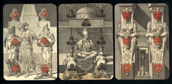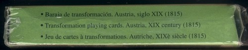 This pack was made by Heinrich Friedrich Müller, Vienna, most probably between 1810 and 1815. See his name on the King of Hearts. This is the Vienese published design of the pack. The cards first appeared in a publication entitled the “Repository of Arts, Literature, Fashion etc” published by Rudolph Ackermann in London. The magazine displayed the cards 4 at a time in 12 issues over the course of 1818, with the January publication from 1819 providing the last 4. The Ackermann published cards have backgrounds in the courts.