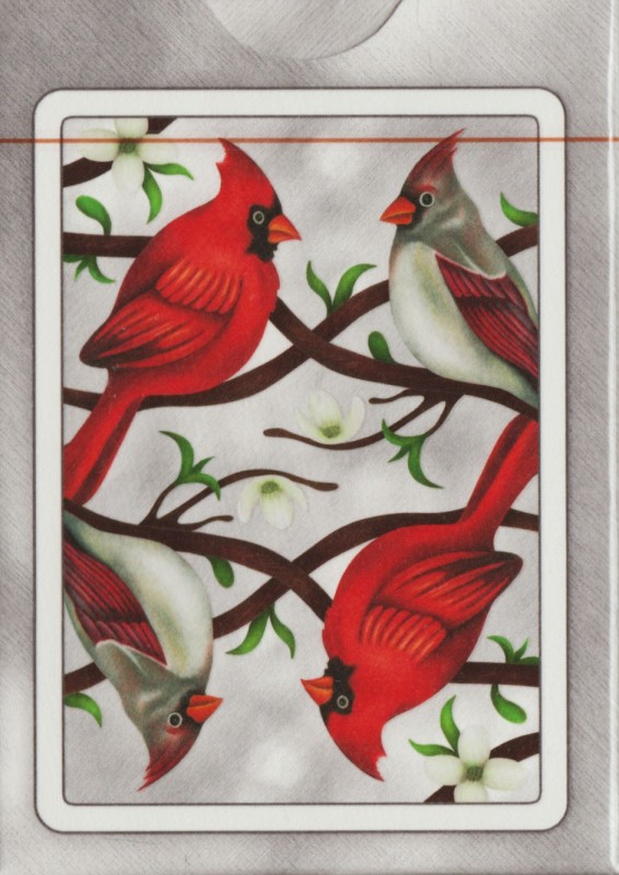 The Back Card for the POKER Deck features a symmetrical illustration of the male and female Cardinals set against the light grey winter-like background. The Face Cards are extremely playable, and the colored pencil backgrounds are subtly added to the PIPs and to the outfits of the standard Courts.