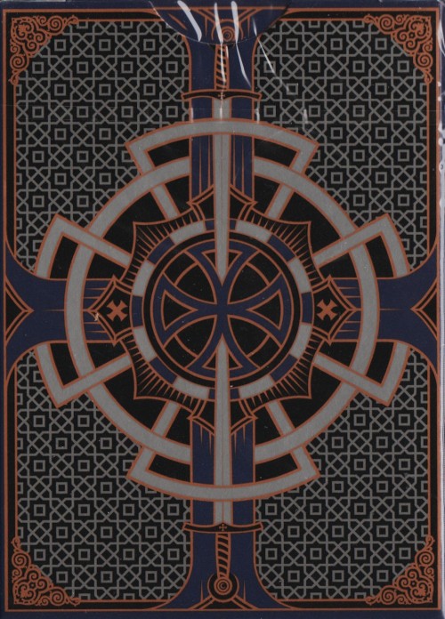 The backs in red/blue, black and gold/copper shows the cross and the sword, symbols from the Templar imagery, in an elaborate symmetrical composition. That symbology is also present in both jokers.