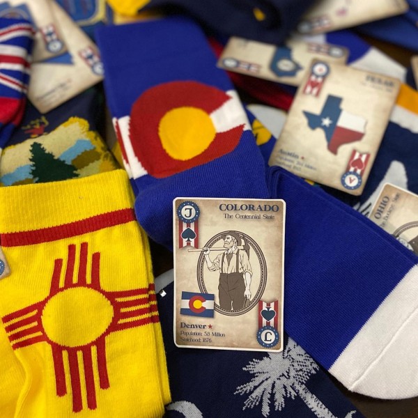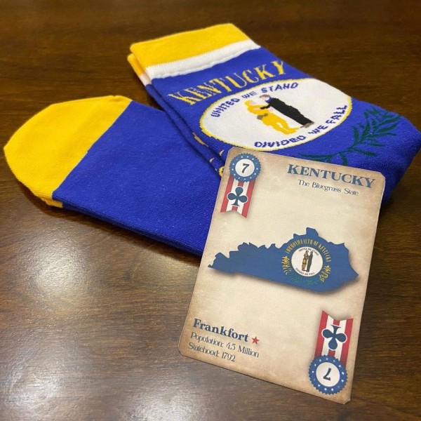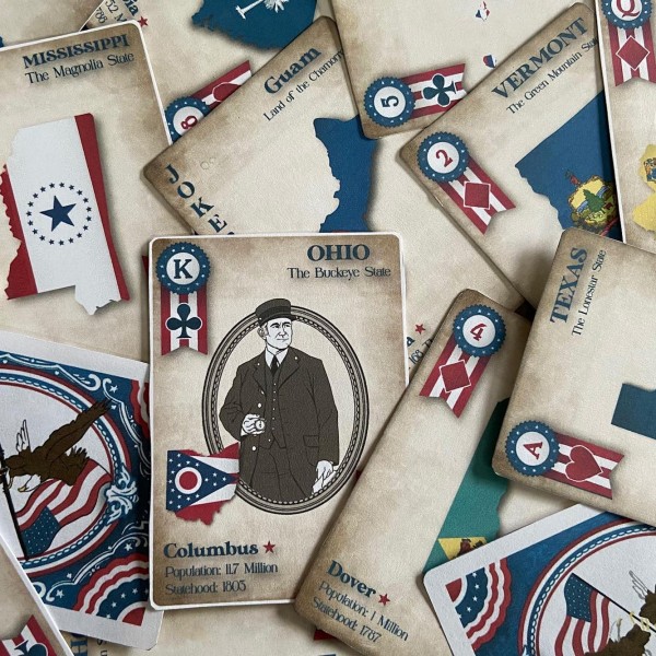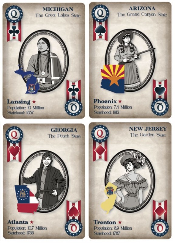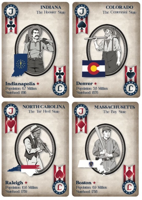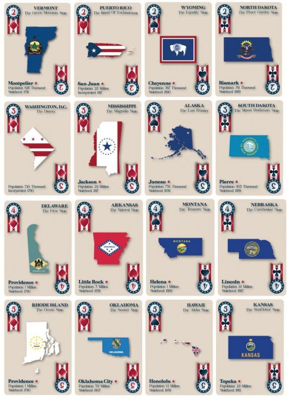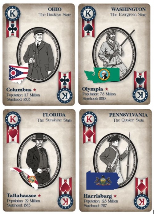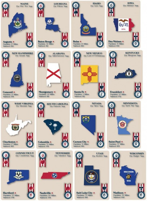 Each card will include the shape of the state or territory while uniquely incorporating their corresponding flag. Additionally, each card will include state facts including capital, population, slogan and year admitted. Adding to the Americana theme, Red, White and Blue ribbon banners display the suit and number of each card on a parchment design reminiscent of the Declaration of Independence.