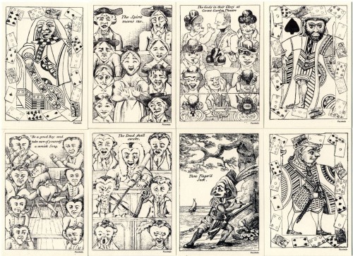 Title:Transformation Playing Cards First Published:1811 Description:For the whole of the 19th century, plus a few years at either end, a minor but attractive social fashion flourished - the "transformation card". This name is derived from the idea of "transforming" an ordinary pip card into a wider picture, it being one of the rules that the pips must form part of the overall design and also remain in their original position on the card. Unquestionably one of the most amusing and ingenious packs ever devised was one designed and etched by I. L. S. Cowell and published in about 1811 or 1812. The original wrapper bore the title "Transformation of Cards. Metastasis". Not only do many timeless social situations (audience at the theatre, congregation in church, greedy employer at table, etc.) receive suitably disrespectful treatment, but there are also glimpses of contemporary entertainment, particularly pantomimes ("Perouse” was produced in 1801 and "Obi" in 1800, for example.) A reference to "The Lady of the Lake" suggests a date for the pack as post 1810, Scott's poem being published in that year. This pack also includes the 5 Clubs "Hottentot Venus". The publishers are indebted to the Master and Wardens of the Worshipful Company of Makers of Playing Cards for permission to reproduce this pack of cards from the Phillips Collection at Guildhall Library and to Miss Sylvia Mann who prepared the Introductory Note. Size:3.9" x 2.5"