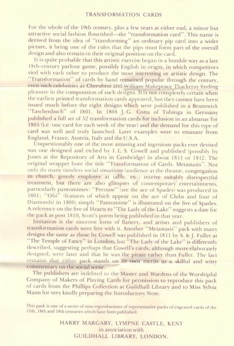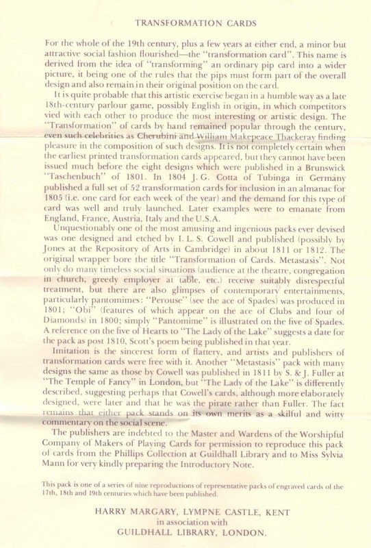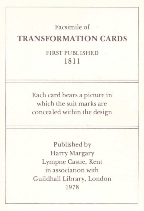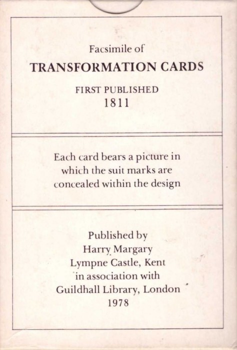 A 1978 reproduction by Harry Margary of the 1811 Metastasis - Transformation of Playing Cards deck. This facsimile is of the Nixon-Cowell-Jones variation of the original 1811 Metastasis deck and was estimated to be printed 1811 or possibly 1812 per Margary. However, recent appraisers and experts have placed the actual publication date as late as 1820. http://www.harrymargary.com/product_details.asp?id=15