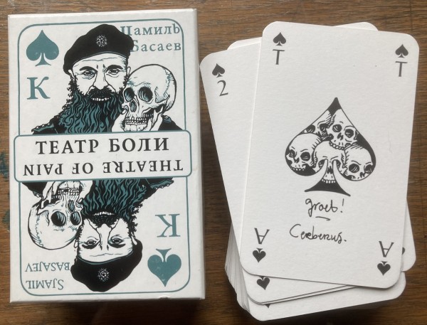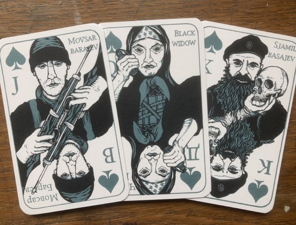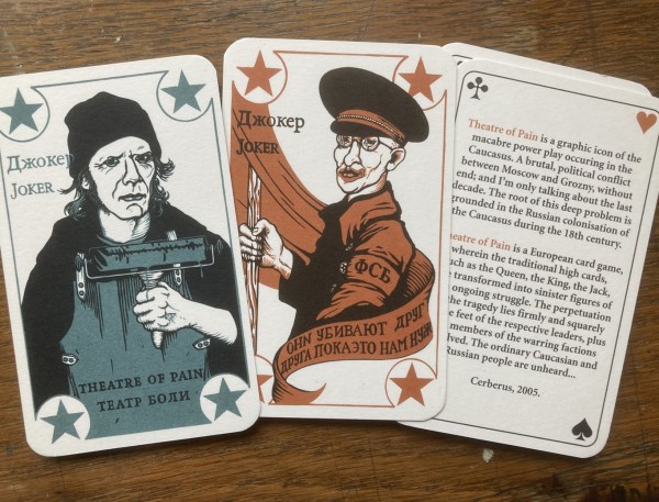 The powerful images were first linocut and then lithographed. The author says "the king, queen and jack are transformed into sinister figures”. The Russian and Chechen leadership are shown on the court cards while some of the queens show the allegorical 'Black Widow' and the 'Soldier's Mother'" The suit signs are printed in muted browns and greys and the backs are a repeat pattern of flowers and skulls. One of the jokers is the artist.