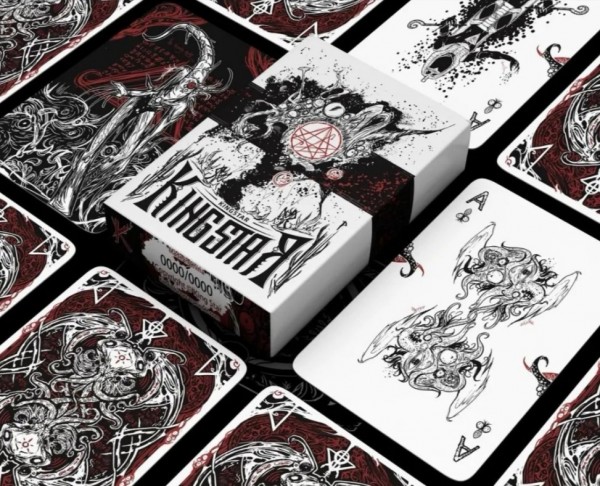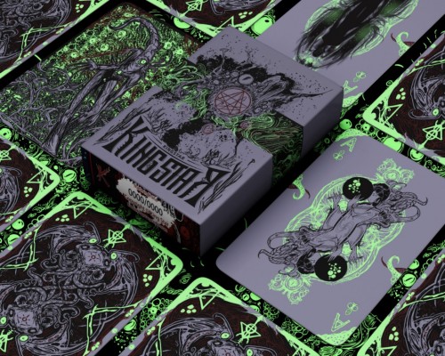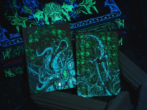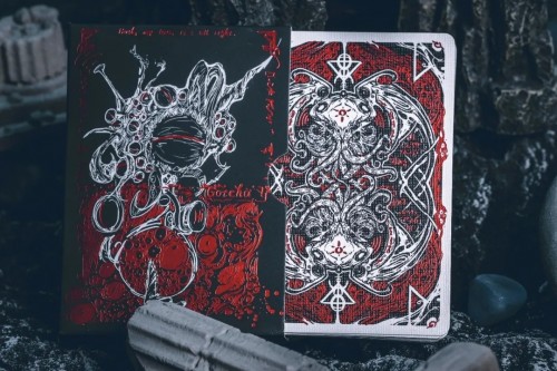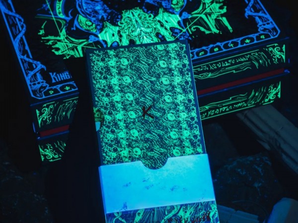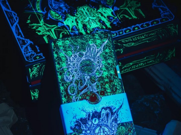 The crystal wall of the universe shattered gradually. "It" was lured into the darkness by the chaotic whispers from the other world. When the pentagram reappears on the earth, all hope is lost. Everything is no longer redeemable. The reversal of the Luen symbol did not merely awaken "It". A deeper fear has quietly descended. Get ready to welcome the arrival of the "old gods" from strange lands. 克苏鲁·混沌之祸 Cthulhu: Curse of Chaos - "Great AZATHOTH I summon you! The destroyer of thought and form, descend upon, possess and grant immortality and eternal darkness to me! Let Nyarlathotep's shroud wrap around me. That way I can walk among the stars." Printed by KSPCC, using 310G German black core paper, limited edition of 2888. Double-layer tuck box, partial gold foil, covered with green invisible ultraviolet light ink technology. The card back uses dark red bronzing foil, with both card sides covered with green invisible ultraviolet light ink technology as well.
