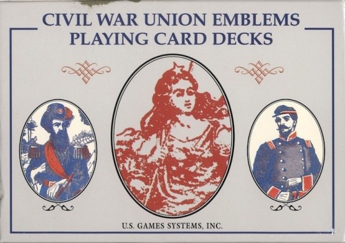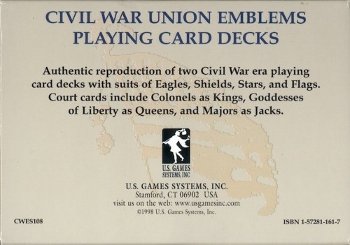 This is a double deck set of two distinct decks printed successively in 1862 and 1863. The original two decks were printed lithographically by the American Card Co. of New York. This is a reproduction, by U.S. Games Systems, of authentic Civil War era playing card decks with suits of Eagles, Shields, Stars, and Flags, and full length court figures. Hochman: Vol 1, page 218, W5 & W6 Fournier: vol. 1, page 288, #35 of North America