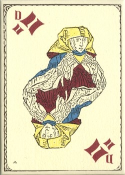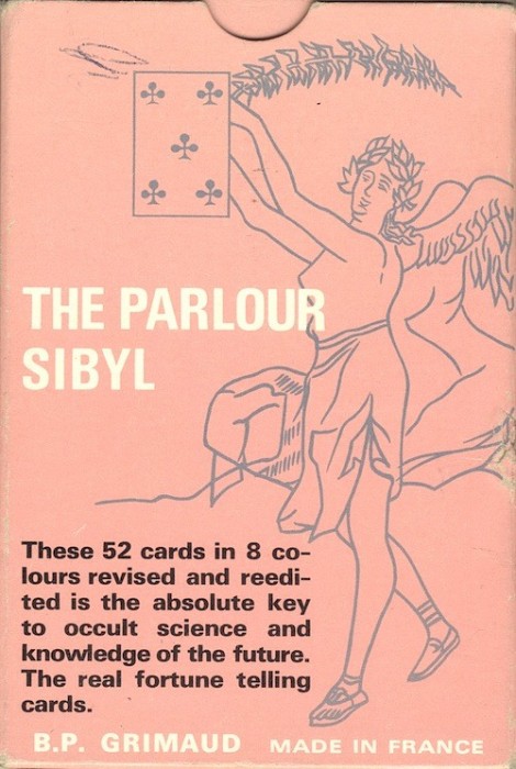 The Parlour Sibyl (Sibyle Des Salons) by Grimaud / France Cartes 52 cards + ad card + booklet Parisian fortune telling playing cards with popular designs made by Mansion in 1830. Top left hand corner shows miniature playing cards. Top right hand corner is numbered and a french title for the card is at the bottom. English versions of those titles appear in light blue at the top of the 1970 edition. Accompanying booklet has \\\"The history and rules of a new card game called The Parlour Sibyl\\\"". Fournier: vol 1
