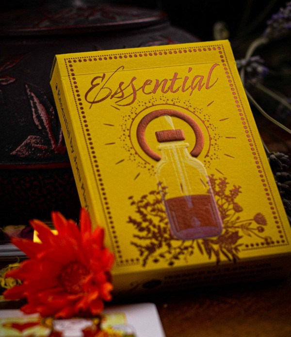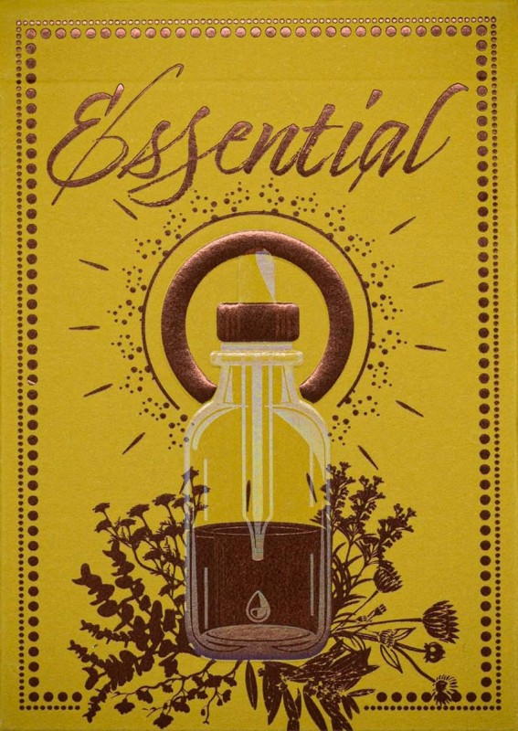 A distant cousin of our beloved Hops & Barley, Essential is a classic deck of cards with an ornate botanical theme, playful colours and some hidden depths. For Essential we wanted to experiment a little, and some of its less obvious features are… Crushed olive dual-tone tuck box with interior gold foil. The inside of the box is made from a special paper stock with crushed olive residue Transparent foiling in multiple layers to create the glass bottle effect on the fronts The first filled backgrounds on any Jocu court cards