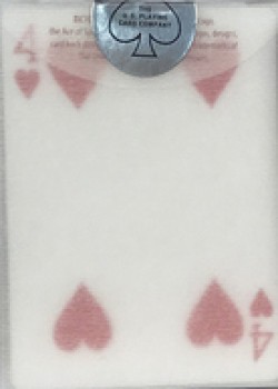 These transparent playing cards have been developed, designed and manufactured by MPC (MakePlayingCards.com). The artwork used on the card fronts uses the standard MPC branded card front and the back of the card uses a beautiful, more complex vector artwork pattern to cleverly cover the same areas as the card indices and pips on the front so other players will not be able to see through and distinguish what cards you are holding easily.