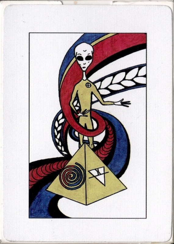 Paul-Son Playing Cards, Inc. printed this deck, and EBE Enterprises of Las Vegas, Nevada is the vendor. It was made in a limited edition. The courts are non-standard, with 12 rather elegent custom Aliens, and pips that are arranged in angular formations like groups of flying UFOs. There are two extra UFO indices on the pip cards and aces, in the lower left and upper right corners, with a different UFO for each suit. The only identification appears on the Ace of Spades with the words \"Made on Terra\""."